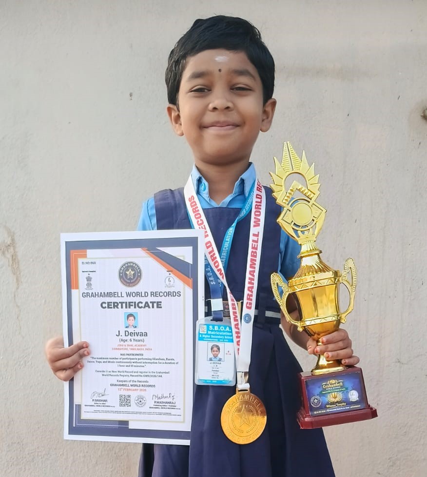 J. Deivaa of Class I-B has earned recognition from the Grahabell World Records for successfully completing a continuous multi-disciplinary performance in Silambam, Karate, Dance, Yoga and Music for an impressive duration of 1 hour and 10 minutes. The remarkable event was organised by JSKA & SMAL Academy, Coimbatore and the record was officially registered on 15th February 2026.